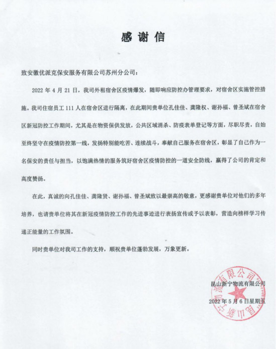 近日,優(yōu)派克集團(tuán)安保公司蘇州分公司,收到客戶單位的表揚(yáng)信,信中對駐點(diǎn)安保日常工作,特別是疫情期間的辛勞付出給予了極大的肯定和褒獎(jiǎng)。合肥保安服務(wù)優(yōu)派克竭力為您服務(wù)!